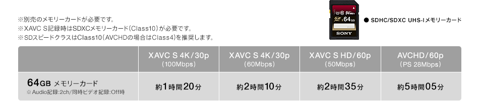 ※ 100Mbps記録時はSDXCカードUHS-I U3以上が必要です。100Mbps録画モードを使用するためには、本体のソフトウェアを最新にする必要があります。詳しくはこちら