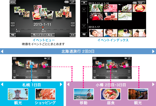 カメラが撮影の頻度を検知。撮影日時情報と合わせて映像を自動的にイベントごとにまとめます。再生画面上で並んでいた映像も、これからは結婚式や運動会などのイベント別にかんたんに楽しめます。