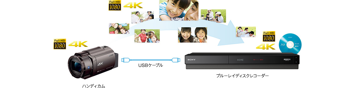 *1 対応ブルーレイディスクレコーダーの情報や、接続方法、映像の取りこみ方法、およびブルーレイディスクへのダビングに関する詳細・条件についてはメーカーのサポートページをご確認ください( https://www.sony.jp/support/handycam/connect/)