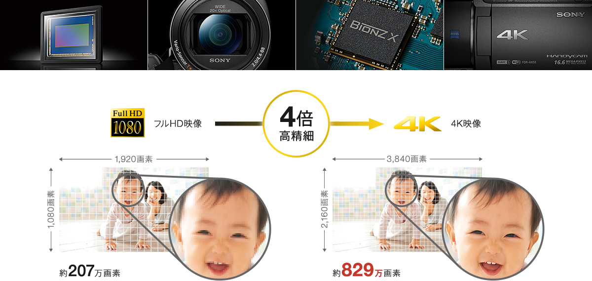 かけがえのない素敵な思い出を、フルハイビジョンの4倍もの画素数を持つ、4K撮影で残せます。FDR-AX55は、高感度センサー、高速画質処理エンジン、“新開発”「ZEISS(ツァイス)バリオ・ゾナーT*(ティースター)」レンズを搭載。卓越した高画質技術の組み合わせにより、4Kならではの高精細映像を実現しました。二度とない思い出のシーンをリアルに再現します。