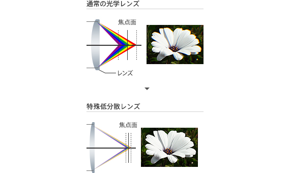 特殊低分散レンズの採用により、ガラス固有の特性により起こる色収差を大幅に低減。色にじみの少ない映像を可能にしました。