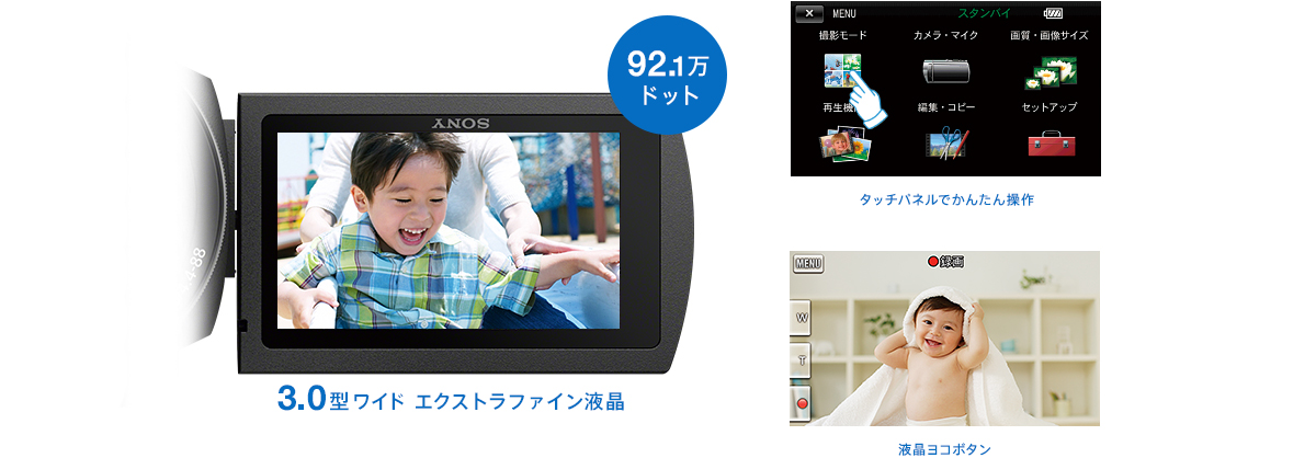 コンパクトな本体ながら、大きな画面で使いやすい3.0型ワイドエクストラファイン液晶を搭載。また、快適に操作できるタッチパネルを採用。タッチパネル内に録画スタート/ストップボタン、ズームボタンも再現しました。