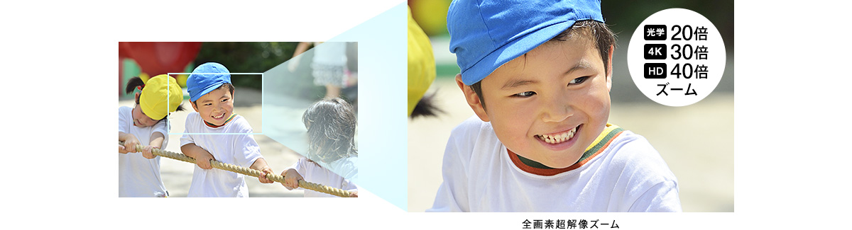 20倍の光学ズームに加えて、4K記録時は30倍、HD記録時は40倍での撮影が可能。しかも、全画素超解像ズームはひとつひとつの画素に対して周辺画素を含めたパターン分類を行い、高精細な映像を作り出すために最適処理します。ズーム時に遠くの風景や人物の画質を保ったまま美しく撮影できます。
