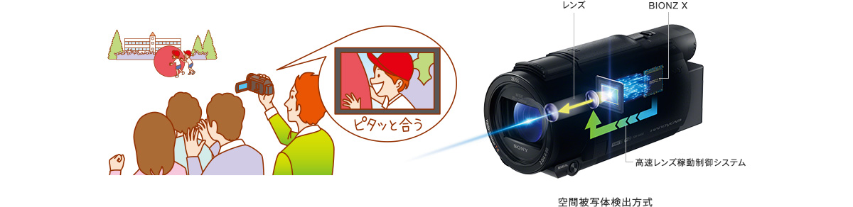 ソニーのα(TM)やサイバーショット(TM)で採用している独自の空間被写体検出方式をハンディカム(TM)にも搭載。従来のオートフォーカス速度に比べて、大幅な高速化を実現。ズームやカメラの向きを変えた際に効果を発揮。撮影チャンスを逃しません。