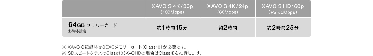 ※ 内蔵メモリーには管理用ファイル、アプリケーションファイルなどが保存されているため、同容量のメモリーカードと記録時間が異なります