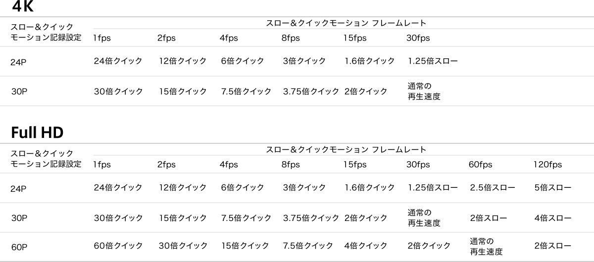 4K動画撮影でのスローモーションとクイックモーションの撮影を実現。撮影フレームレートを1fpsから30fpsまでの6段階から選択でき、最大30倍までのクイックモーションと、最大1.25倍までのスローモーションを最大100Mbpsで記録できます。また、フルHDなら、撮影フレームレートを1fpsから120fpsまでの8段階から選択でき、最大60倍までのクイックモーションと、最大5倍までのスローモーションを最大50Mbpsで記録できます。