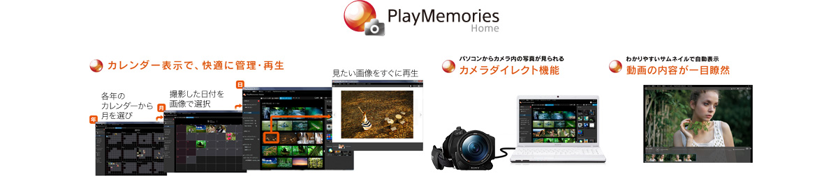 カレンダー表示で撮った映像をかんたんに整理・検索・再生が行えます。ハンディカムとパソコンをつなぐだけで、カメラ内の映像を取りこまなくても見ることができます。パソコンに取りこんでブルーレイディスクやDVDを作成したり、その他の便利な機能を使ったり、楽しくかんたんに管理、活用できます。