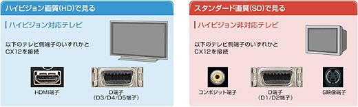 ハイビジョン撮影した映像は、ビデオ入力があればハイビジョン対応以外のテレビでも見られます(ただしスタンダード画質)。また、HDMIミニコネクターを搭載。HDMI対応のテレビとつなげば、ケーブル1本で映像も音声もデジタルのまま高画質で再生できます。