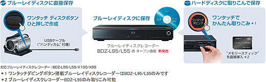 “ハンディカム”を付属のUSBケーブルでDVDライターに接続し、ハンディカムステーションのワンタッチディスクボタンをひと押し。パソコンを使わずに、ハイビジョン画質DVDを手軽に作成できます。“メモリースティック”に記録されたハイビジョン映像を DVDライターの“メモリースティック デュオ”スロット経由でダビングもできます(*)。