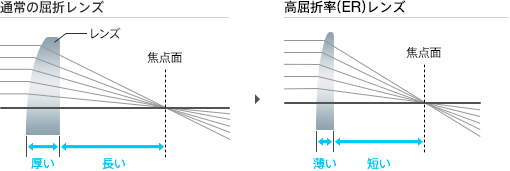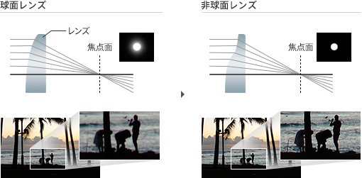 非球面レンズを採用し、レンズ中心付近と周辺付近を通る光が一点に集まらないという球面収差を低減。メリハリの効いた美しい映像を実現します。
