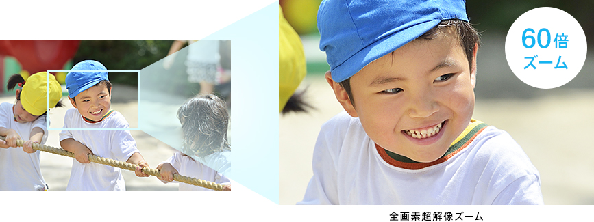 光学30倍ズームに加えて、60 倍の「全画素超解像ズーム」機能を搭載。ひとつひとつの画素に対して周辺画素を含めたパターン分類を行い、高精細な映像を作り出すために最適処理。ズーム時に遠くの風景や人物の画質を保ったまま美しく撮影できます。
