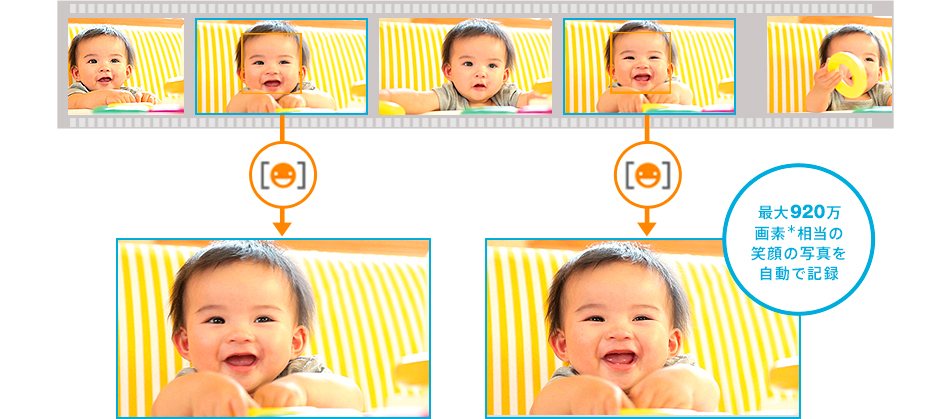 動画撮影中にフォトボタンを押すと、最大920万画素相当(16:9)の写真を同時に記録できます(*)。動画でも写真でもベストシーンを残せます。スマイルシャッター機能でも撮影。笑顔を検出して自動で撮影される「スマイルシャッター」の写真も、920万画素相当(16:9)の高画質で記録します。