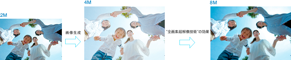 「全画素超解像技術」により、静止画までも驚くほど鮮明に再現します。対象の画素だけでなく、周辺の画素も含め分析し、その結果とデータベースに蓄積されたパターンを組み合わせ、各画素に最適な処理を施すことで、さらなる高画質を実現。229万画素の最大約4倍(*)という緻密で高精細な画像が得られます。