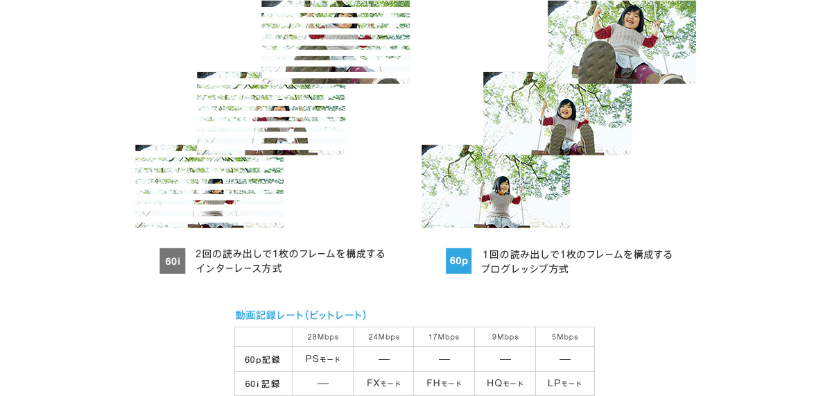2回の読み出し時間をかけて1フレームを構成するインターレース方式に比べて、1回の読み出しで1フレームを構成するプログレッシブ方式。プログレッシブ方式は時間当たり約2倍の情報量なので、より高精彩な記録を実現します。