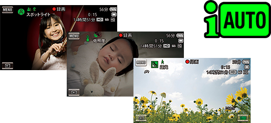 「顔」「シーン」など、5つの要素から撮影シーンを認識。180通りの組み合わせの中から、撮影状況に合わせた最適な映像が取れるように自動設定。いつでもだれでも、美しい映像が残せます。