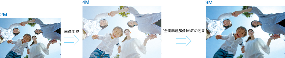 「全画素超解像技術」により、静止画までも驚くほど鮮明に再現します。対象の画素だけでなく、周辺の画素も含め分析し、その結果とデータベースに蓄積されたパターンを組み合わせ、各画素に最適な処理を施すことで、さらなる高画質を実現。229万画素の最大約4倍(*)という緻密で高精細な画像が得られます。
