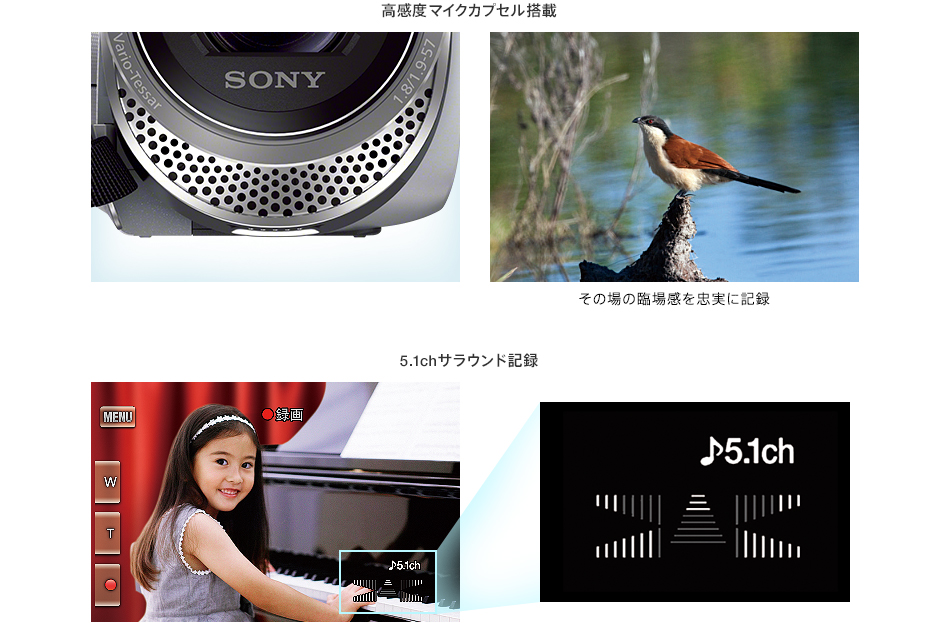 高感度マイクロカプセルを搭載し、高密度でクリアな音質で記録します。また、ズームに連動して音声レベルも変化。ドルビーデジタル5.1chのサラウンド記録ができるので、対応する機器で再生すれば、臨場感あふれる音声が甦ります。
