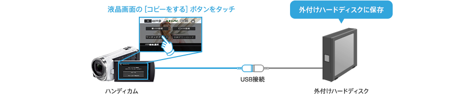 USBアダプターケーブル(別売)を使って、ハンディカムと外付けハードディスクを接続すれば、かんたんに撮影した映像を保存できます。さらにテレビでの再生も楽しめます。