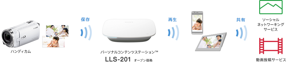 ハンディカムで撮影した動画や静止画をパーソナルコンテンツステーションにワイヤレスで保存・再生・共有ができます。
