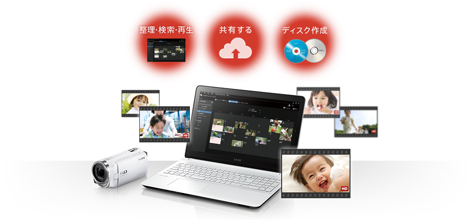 カレンダー表示で撮った映像をかんたんに整理・検索・再生が行えます。ハンディカムとパソコンをつなぐだけで、カメラ内の映像を取りこまなくても見ることができます。パソコンに取りこんでブルーレイディスクやDVDを作成したり、その他の便利な機能を使ったり、楽しくかんたんに管理、活用できます。