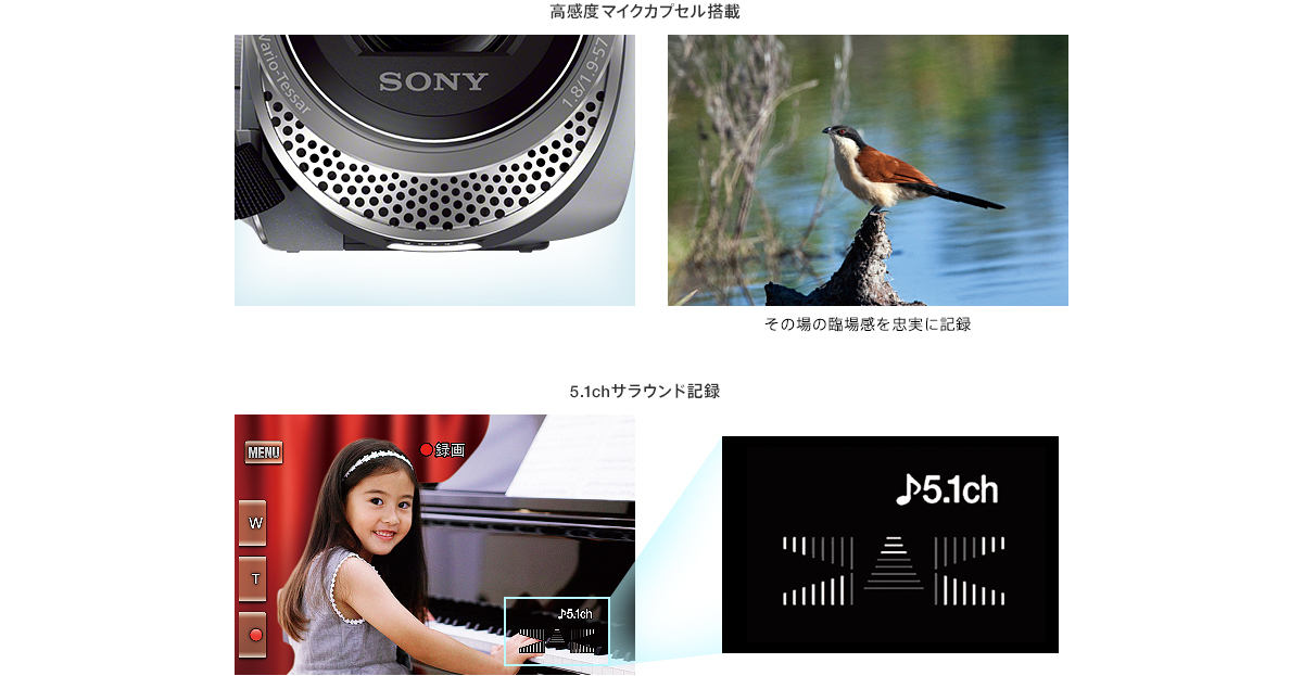 高感度マイクロカプセルを搭載し、高密度でクリアな音質で記録します。また、ズームに連動して音声レベルも変化。ドルビーデジタル5.1chのサラウンド記録ができるので、対応する機器で再生すれば、臨場感あふれる音声が甦ります。