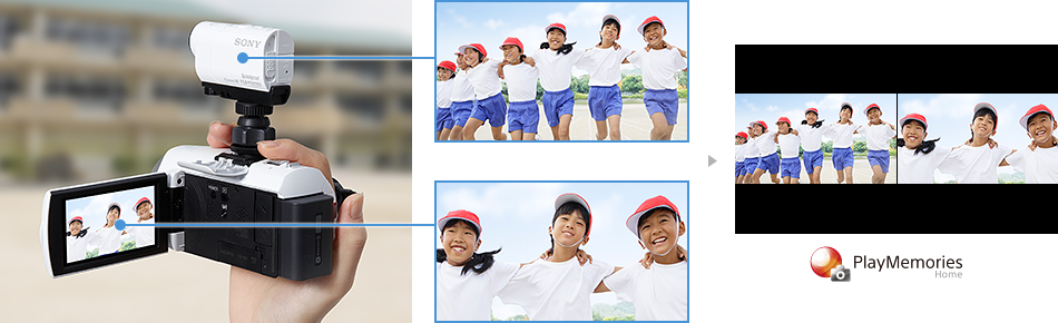 ハンディカムと、サイバーショット(*1)なら1台、アクションカム、レンズスタイルカメラは最大5台(*2)までWi-Fiで同時接続、同時撮影が可能。一度の操作で一斉に撮影のスタート/ストップや、接続した各カメラの映像を切り替えてモニタリングしながら、望遠やワイドのマルチアングル撮影などが可能です。ハンディカムで動画を撮影しながら、サイバーショットで高画質の静止画を撮影したり、アクションカムで超広角な動画を撮影するなど、楽しみが一気に広がります。