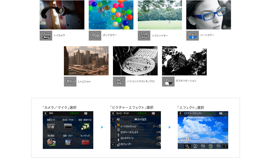 画面周辺の色を落とし、レトロな作風が作れる「トイカメラ」や柔らかい光で透明感のある画像が作れる「ソフトハイキー」など、7種類の「ピクチャーエフェクト」機能を搭載。ライブビュー上で効果を確認しながら印象的な作品が撮影できます。