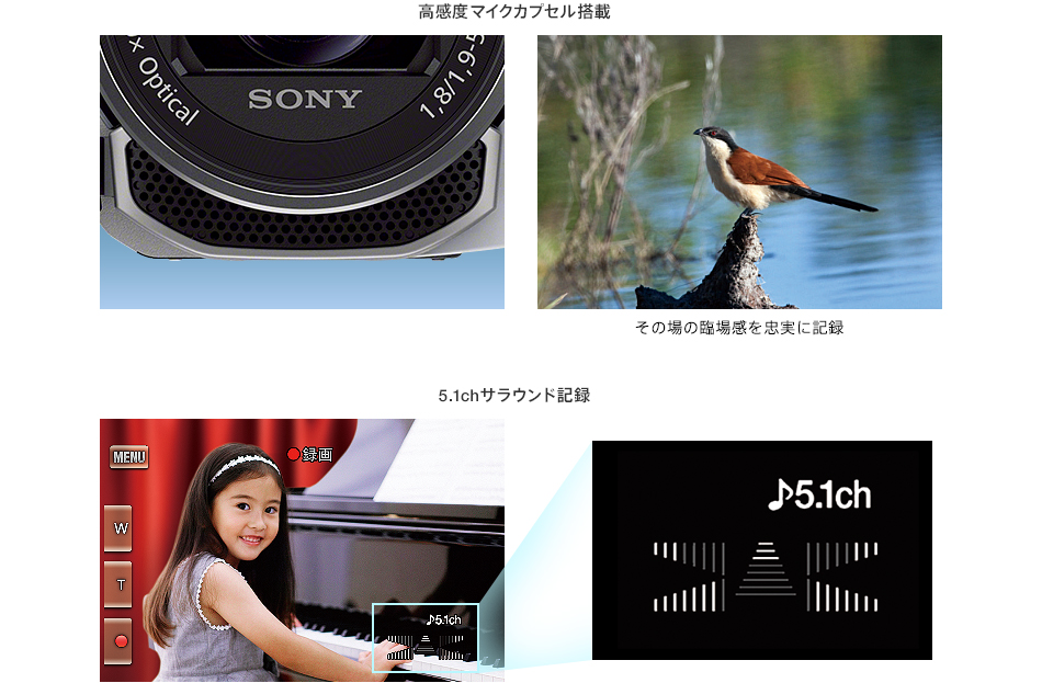 高感度マイクロカプセルを搭載し、高密度でクリアな音質で記録します。また、ズームに連動して音声レベルも変化。ドルビーデジタル5.1chのサラウンド記録ができるので、対応する機器で再生すれば、臨場感あふれる音声が甦ります。