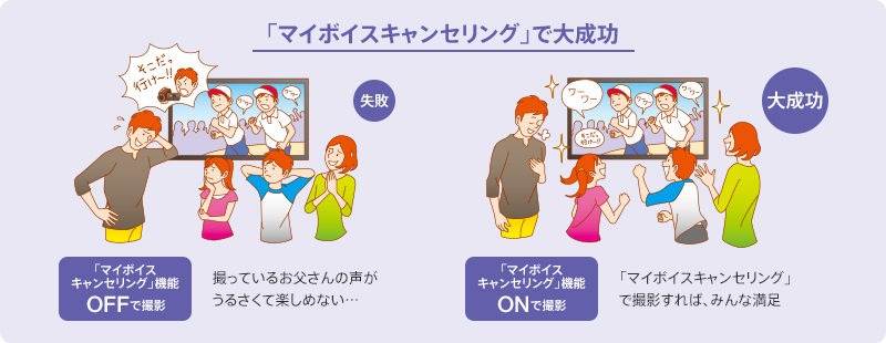 被写体の声や周辺の音はそのままに、撮影者の声を大幅に低減して録音できます。たとえば、運動会でわが子を大声で応援をしながら撮影しても、自分の声ばかりが目立つという心配はありません。