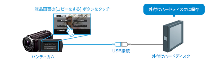 USBアダプターケーブル(別売)を使って、ハンディカムと外付けハードディスクを接続すれば、かんたんに撮影した映像を保存できます。さらにテレビでの再生も楽しめます。