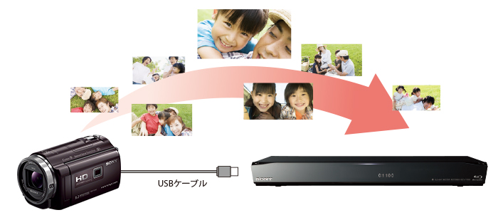 ※ USBケーブルを使用した場合、MP4形式の動画はブルーレイディスクレコーダーに取りこむことはできません。別売のマルチ端子ケーブルVMC-15MR2を使用して、A/V出力(スタンダード画質)でブルーレイディスクレコーダーに取りこんでください