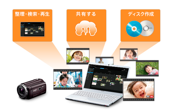 カレンダー表示で撮った映像をかんたんに整理・検索・再生が行えます。ハンディカムとパソコンをつなぐだけで、カメラ内の映像を取りこまなくても見ることができます。パソコンに取りこんでブルーレイディスクやDVDを作成したり、その他の便利な機能を使ったり、楽しくかんたんに管理、活用できます。
