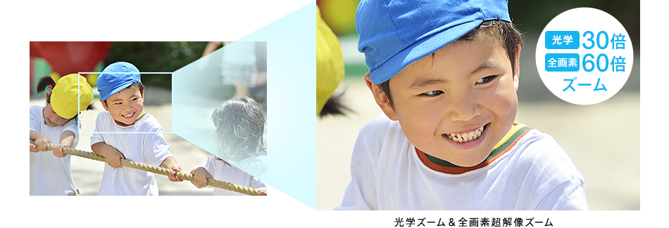 光学30倍ズームに加えて、60倍の「全画素超解像ズーム」機能を搭載。ひとつひとつの画素に対して周辺画素を含めたパターン分類を行い、高精細な映像を作り出すために最適処理。ズーム時に遠くの風景や人物の画質を保ったまま美しく撮影できます。