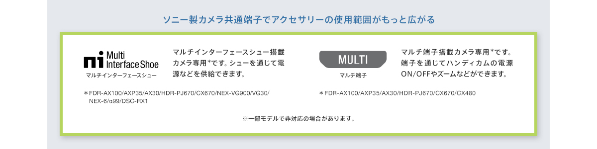 ソニーカメラ製品共通シューとして「マルチインターフェースシュー端子」、「マルチ端子」を搭載。アクセサリーの互換性を拡大することで幅広い撮影をお楽しみいただけます