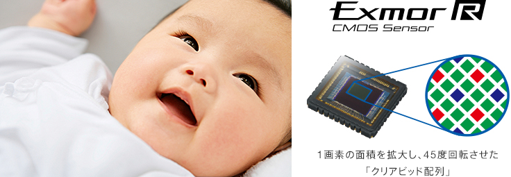 16:9型の「Exmor R CMOSセンサー」を搭載。16:9型を採用しているので動画の有効画素数が大幅にアップ、さらに高精細な映像が得られます。