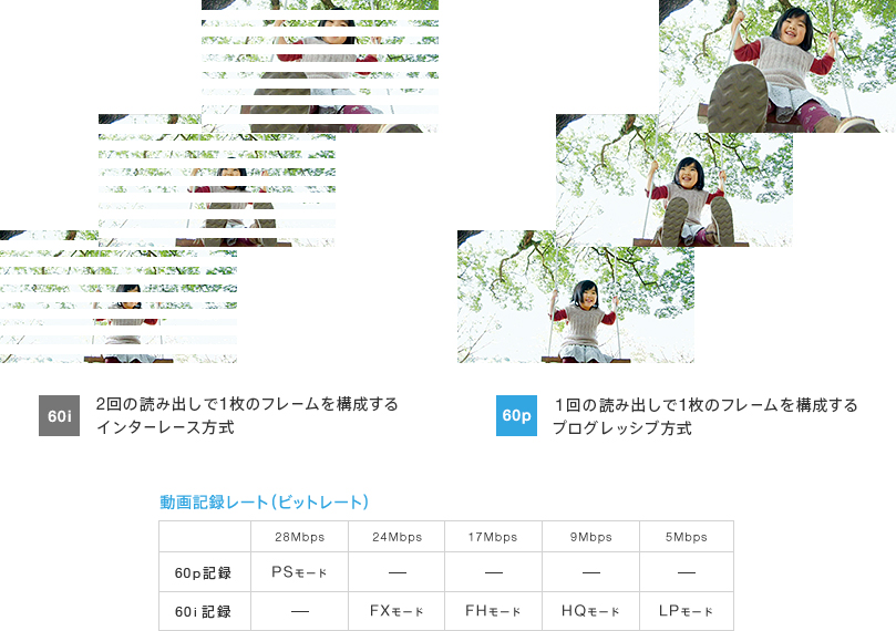 2回の読み出し時間をかけて1フレームを構成するインターレース方式に比べて、1回の読み出しで1フレームを構成するプログレッシブ方式。プログレッシブ方式は時間当たり約2倍の情報量なので、より高精彩な記録を実現します。