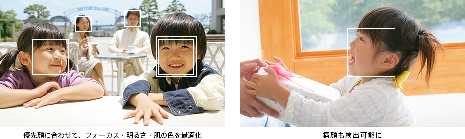 カメラが自動的に検出した複数の人物から優先したい顔にタッチすれば、“フォーカス”“明るさ”“肌の色”を優先的に最適化する「優先顔キメ機能」がさらに進化。正面だけでなく横顔でもしっかり検知します。さらに、顔検出に連動して、人の声認識し、周りのノイズを低減してくれる「くっきり音声」も新しく搭載しました。