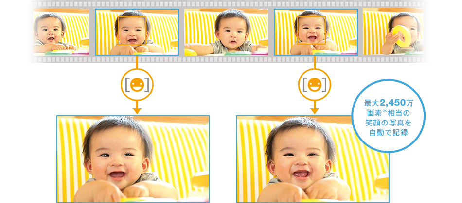 動画撮影中にフォトボタンを押すと、最大2,450万画素相当(16:9)の写真を同時に記録できます(*)。動画でも写真でもベストシーンを残せます。スマイルシャッター機能でも撮影。笑顔を検出して自動で撮影される「スマイルシャッター」の写真も、2,450万画素相当(16:9)の高画質で記録します。