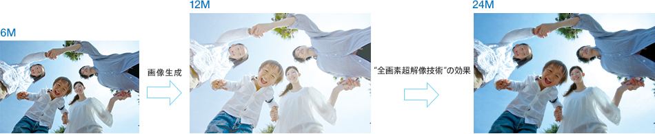 「全画素超解像技術」により、静止画までも驚くほど鮮明に再現します。対象の画素だけでなく、周辺の画素も含め分析し、その結果とデータベースに蓄積されたパターンを組み合わせ、各画素に最適な処理を施すことで、さらなる高画質を実現。614万画素の最大約4倍(*)という緻密で高精細な画像が得られます。