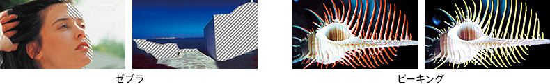 液晶画面上に、輝度の高い部分のみに縞状の模様をつけるゼブラ表示。ゼブラを表示させれば明るさを調整する際の目安として使用でき、白とびを防止できます。また、輪郭を強調して表示しピントを合わせやすくするピーキングは、マニュアルフォーカスで撮影する場合に便利です。
