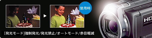 ビデオライトを内蔵。フラッシュモードをオートにすると、撮影状況により光量が足りないと判断した場合、自動的に発光します。