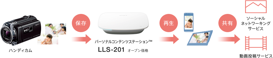 ハンディカムで撮影した動画や静止画をパーソナルコンテンツステーションにワイヤレスで保存・再生・共有ができます。