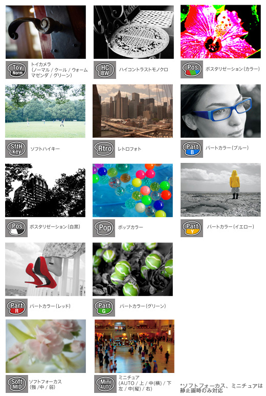 動画11種類、静止画13種類の多彩なエフェクトを駆使することで、肉眼での見たままとは異なった、楽しい映像表現が編集することなく撮影可能となります。