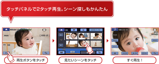 日付/映像/人物の顔からかんたん検索。見たいシーンをタッチするだけですぐに再生できます。また、シーンの削除や並べ替えなどの、かんたんな編集もできます。
