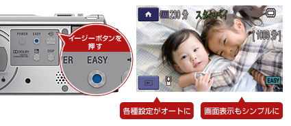 イージーボタンを押せば、撮影のさまざまな設定がオートに。設定を間違えることもなく、はじめての方でも手軽に撮れます。