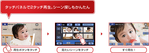 日付/映像/人物の顔からかんたん検索。見たいシーンをタッチするだけですぐに再生できます。また、シーンの削除や並べ替えなどの、かんたんな編集もできます。
