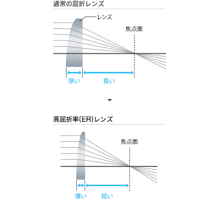 非球面レンズを採用し、レンズ中心付近と周辺付近を通る光が一点に集まらないという球面収差を低減。メリハリの効いた美しい映像を実現します。