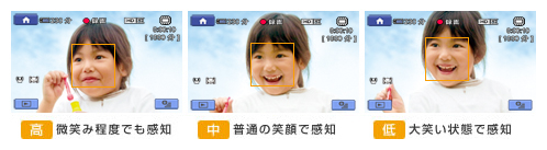 ふとした微笑みから大笑いまで、笑顔を感知する感度を3段階に設定できます。