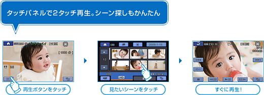 タッチパネルのかんたん操作で、本体でシーンの削除や分割などができます。いらない場面や内容の整理を、撮ったその場で手軽にできます。