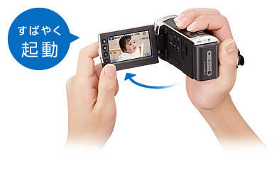 液晶パネルの開閉で電源ON/OFF。撮りたい瞬間に出会ったら、液晶パネルを開くだけ。すばやく撮影できます。